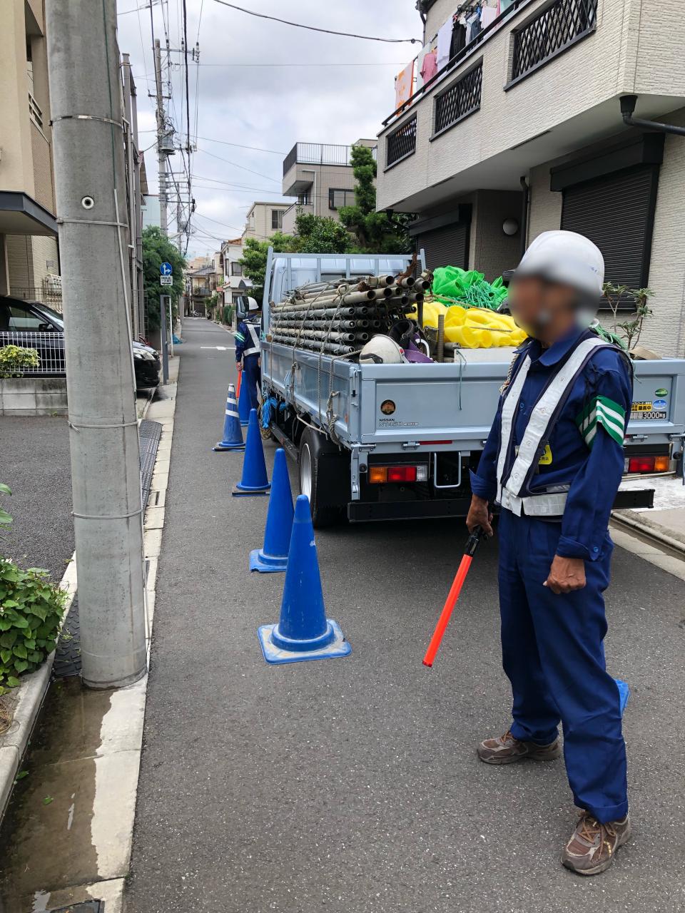 通行が狭い時はガードマンさんと連携しながら解体します。